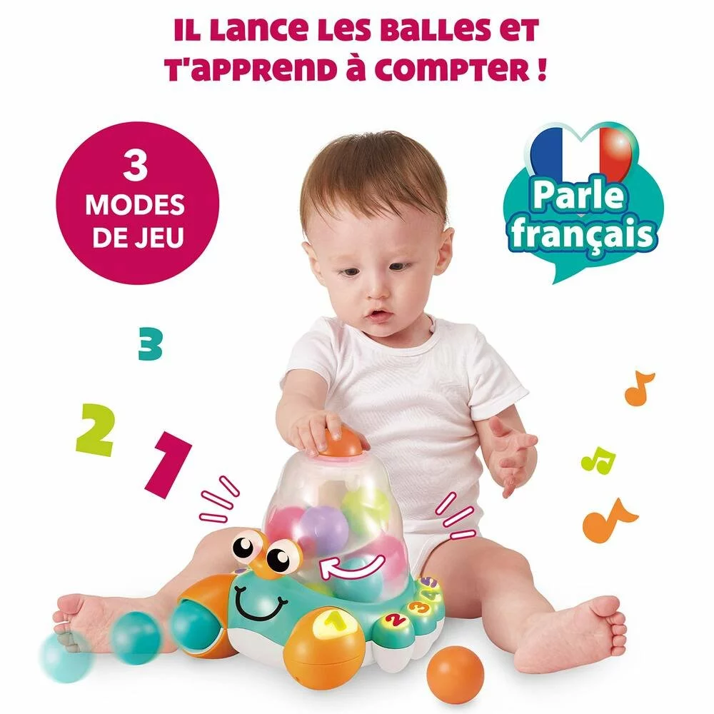 MODE JEU LIBRE : l’enfant insère les balles et lorsqu’il appuie sur un des chiffres, le crabe lance les balles en tournant sur lui-même. Bébé est encouragé à se déplacer pour aller chercher les balles lancées ! MODE DÉCOUVERTE : l’enfant insère les balles et le crabe compte les balles en allumant les boutons des chiffres au fur et à mesure. MODE QUESTION : le crabe dit un chiffre et l’enfant doit le trouver ou le crabe demande à l’enfant d’insérer un certain nombre de balles. 40 musiques, sons et mots.