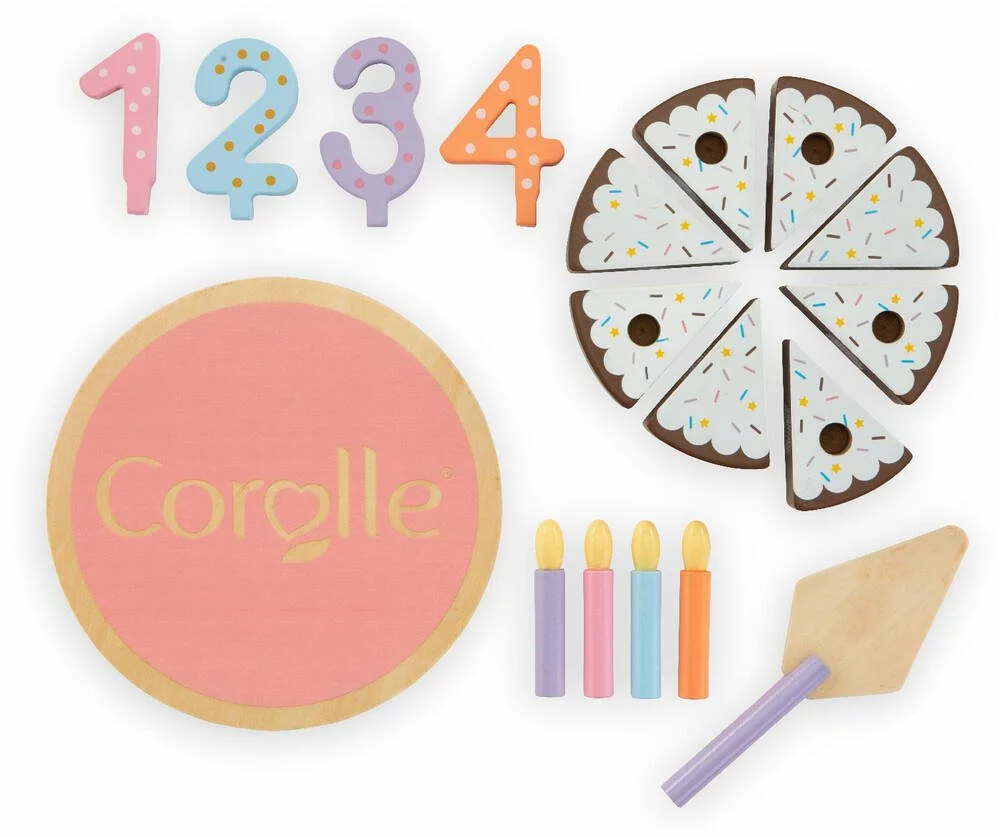 Le Gâteau Anniversaire Bois est parfait pour fĂŞter l’anniversaire de son grand poupon de 36 ou 42 cm. Il comprend 18 accessoires : huit parts de gâteau avec bandes auto-agrippantes prĂŞtes Ă ĂŞtre servies; quatre chiffres (1;2;3 et 4); quatre bougies; une pelle Ă gâteau et un plateau.