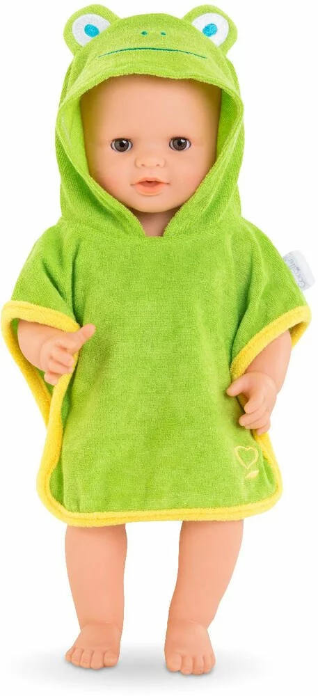 Cette amusante cape de bain à la capuche « tête de grenouille » séchera et réchauffera les grands poupons de 36 cm à la sortie du bain.