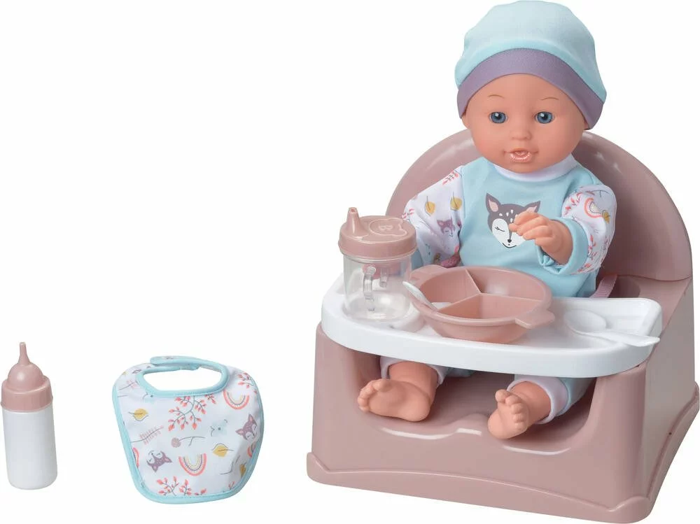 Poupon de 35 cm. Contient : un siège avec un plateau amovible pour le repas, une assiette, une cuillère, une fourchette, un verre à bec, un bavoir en tissu et un biberon. Dimensions du siège seul : 22 x 21 x 19 cm