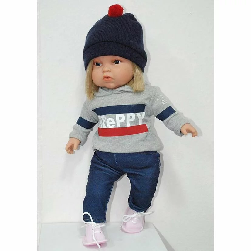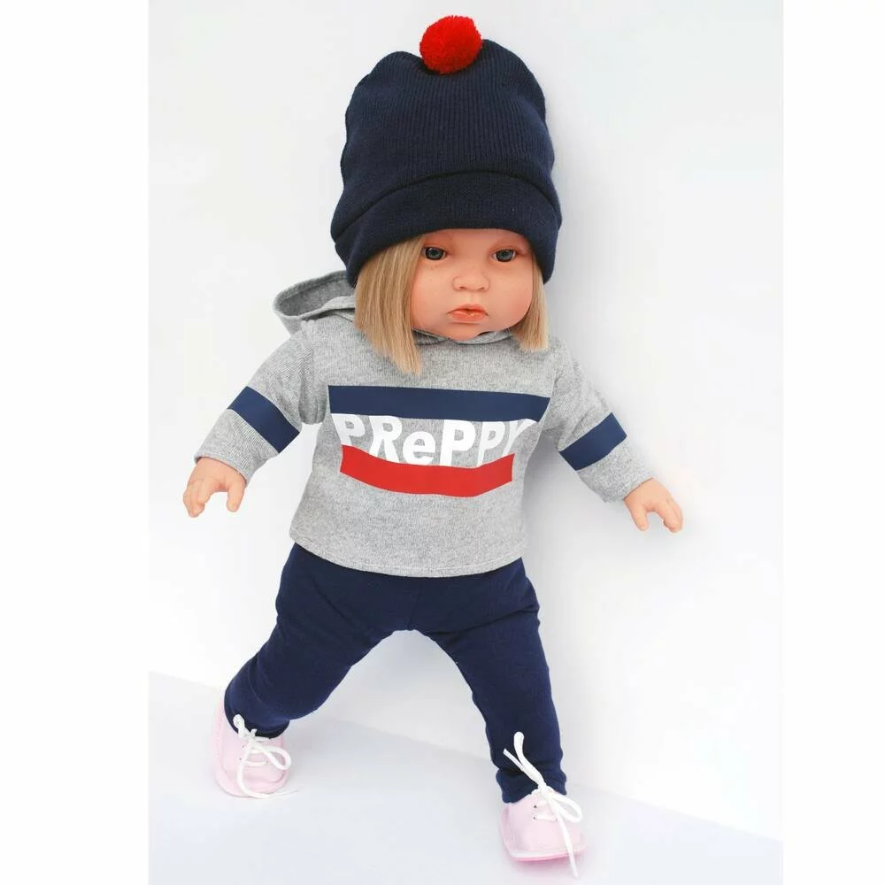 Poupée de 45 cm, au corps souple avec des parties en vinyle. Habits très tendance. Avec un bonnet, un pull imprimé avec capuche, un pantalon et des chaussures. Vêtements : laver à la main séparément, séchage à l’air libre, ne pas repasser.