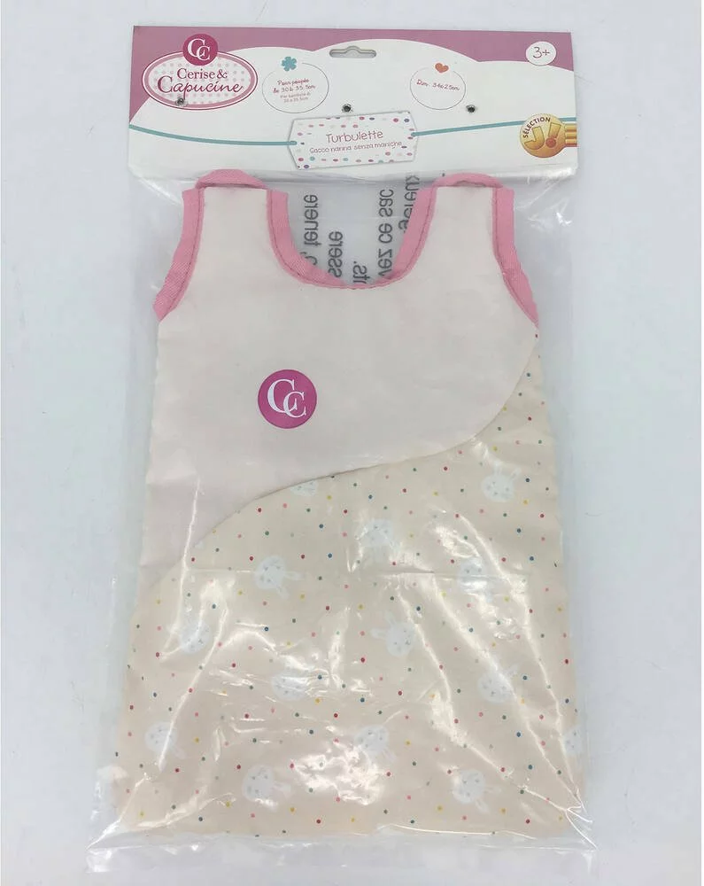 Convient aux poupĂ©es jusqu’Ă 40 cm. Cette turbulette ou gigoteuse est un vĂŞtement qui laisse dĂ©couverts les bras et la tĂŞte de ta poupĂ©e pour dormir. 100% polyester. Laver uniquement en surface. PoupĂ©e non fournie.