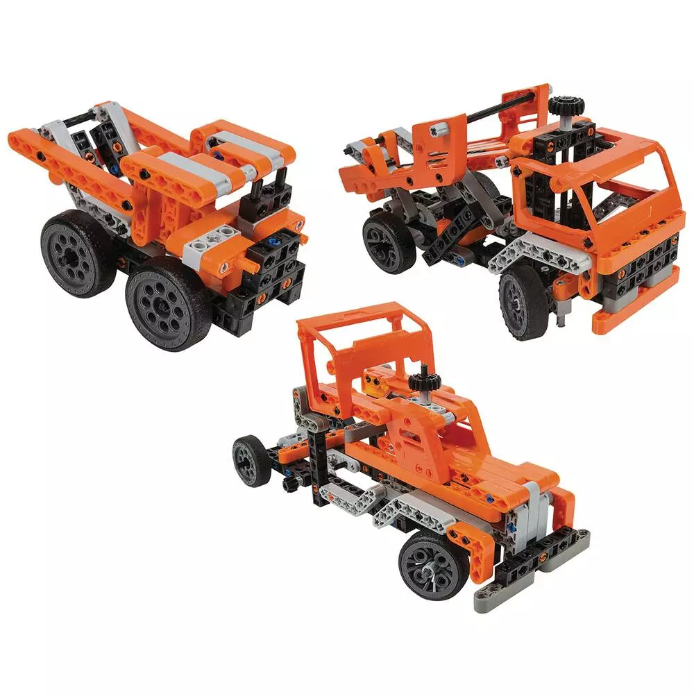 Construis d’incroyables Camions de Transport et découvre comment ils fonctionnent. Expérimente les transmissions, utilise des engrenages… 10 modèles à assembler à l’aide des 200 composants dont : engrenages, poulies, différentiel, pneus avec jantes etc. Le manuel illustré expliquera à l’enfant comment construire les modèles et lui apportera également des informations scientifiques.