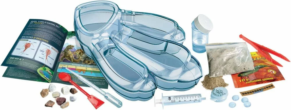 Un aquarium unique pour donner vie aux Triops, des créatures préhistoriques fascinantes. Le bassin d’observation est équipé d’une loupe, d’un thermomètre et de nombreux autres composants pour en savoir plus sur ces espèces anciennes. Les œufs et la nourriture sont inclus ! Les Triops vivent en moyenne 1 à 2 mois et peuvent mesurer 3 à 4 centimètres. Contient de la nourriture, 1 loupe, 1 thermomètre, 1 sachet de sable et de nombreux accessoires.