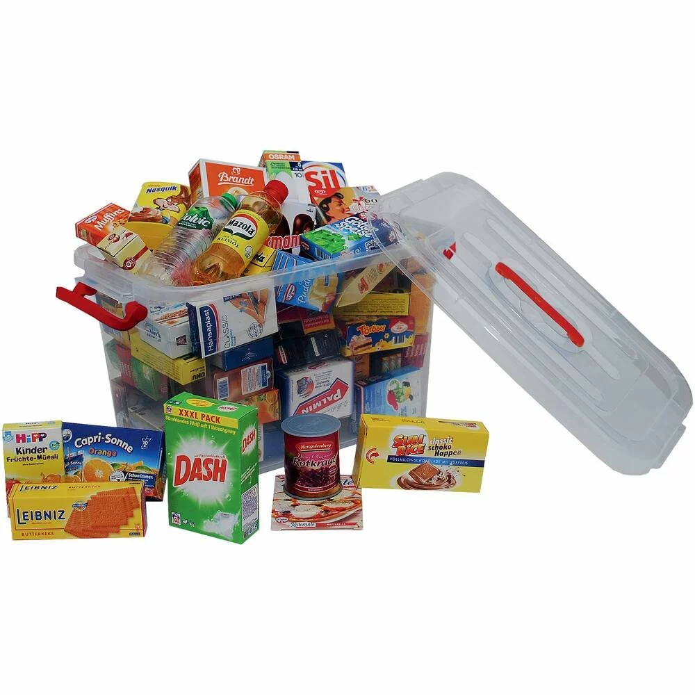 Boîte plastique comprenant une quarantaine de miniatures (marchandises factices). Le contenu (miniatures d’emballage) peut varier selon disponibilité. Pratique tout se range dans la boîte en plastique transparent et se transporte grâce à une poignée sur le dessus du couvercle. Boîte pratique contenant de nombreuse miniatures et dont la transparence permet de voir le contenu.