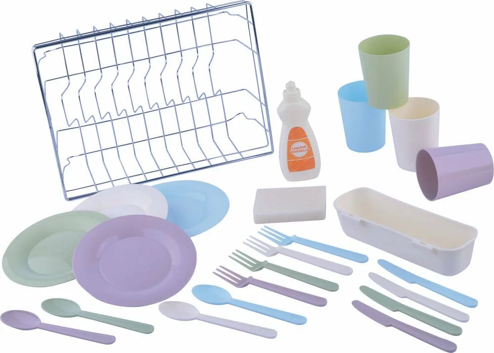 Un kit complet de 23 pièces pour jouer à la dînette ou préparer de bons petits plats comme un vrai chef ! Egouttoir contenant 4 assiettes (diamètre 15 cm), 4 couteaux, 4 fourchettes, 4 cuillères, 4 verres, 1 éponge, 1 bouteille de produit vaisselle (factice) et un panier à couverts en plastique. En métal et plastique.