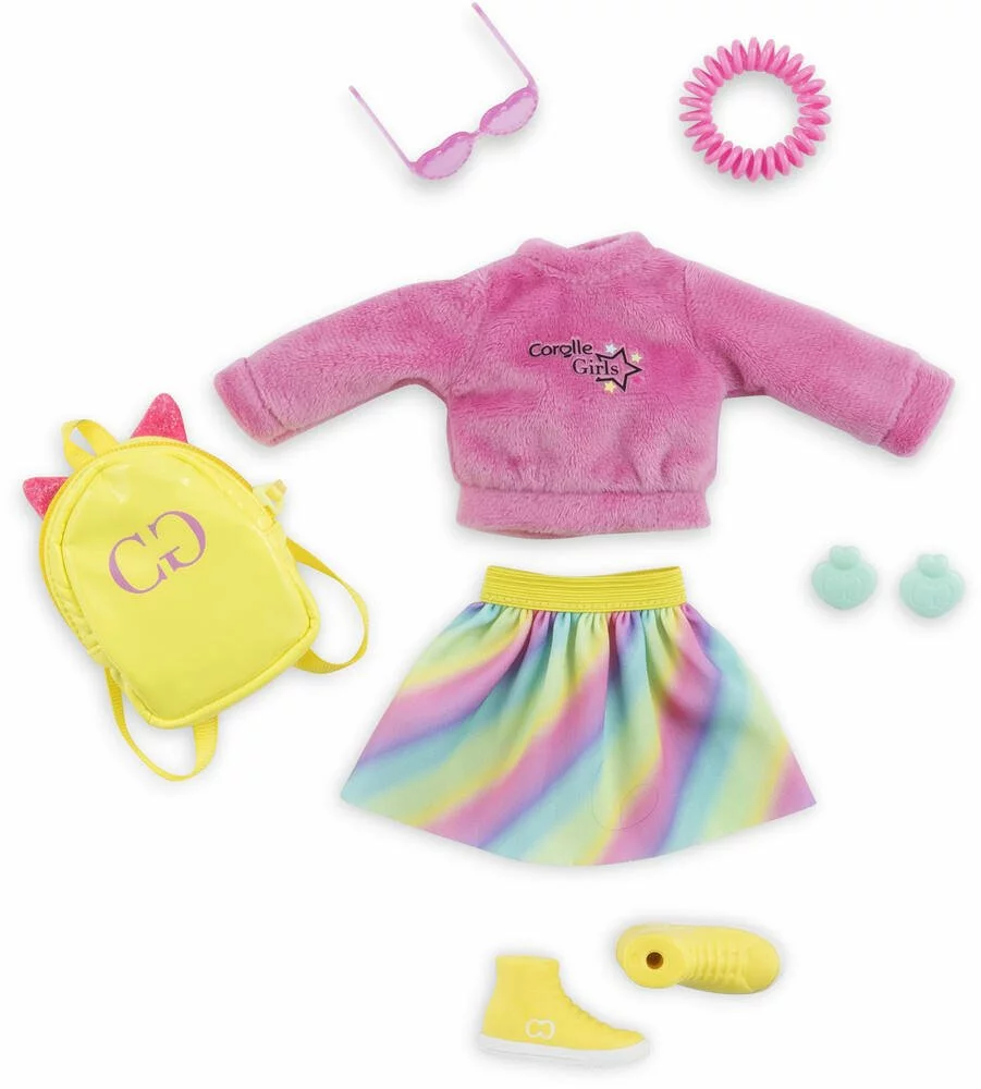 Le Dressing Fluo constitue une tenue complète composée de 7 accessoires mode et décontractés à porter en toutes circonstances : 1 sweat-shirt, 1 jupe, 1 paire de boucles d’oreilles, 1 élastique pour les cheveux à spirales, 1 paire de lunettes de soleil, 1 paire de baskets amovibles et 1 sac à dos. Le Dressing Fluo peut être combiné avec les autres Coffrets Dressing Corolle Girls et les Coffrets Poupées Corolle Girls pour stimuler encore plus l’imagination de vos enfants dès 4 ans.