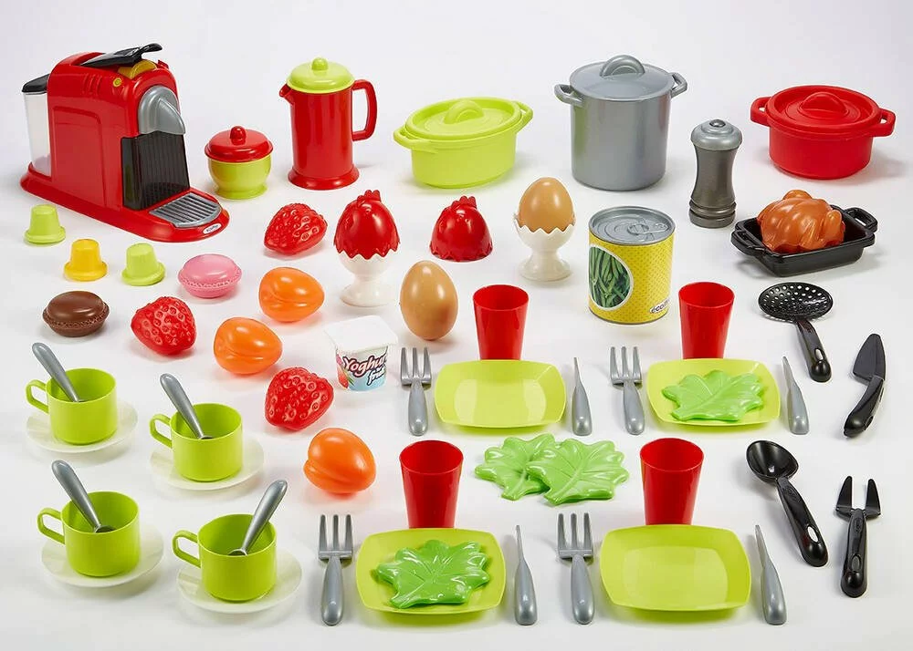 70 accessoires de dinette dans ce baril solide et pratique pour le rangement.