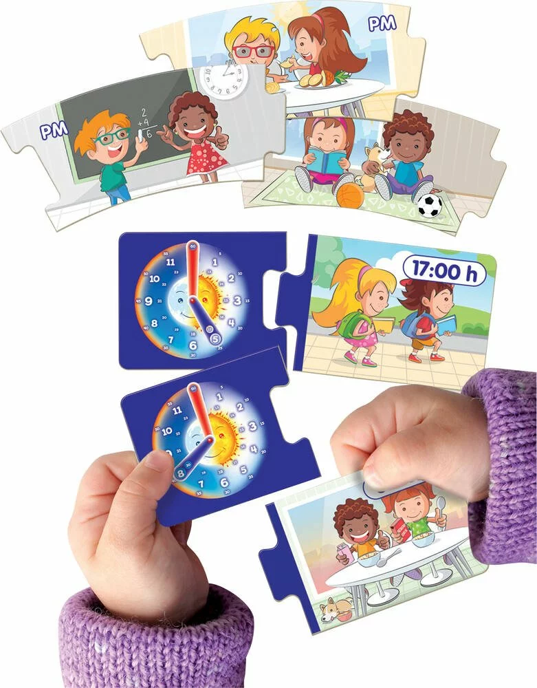 Apprends à lire l’heure et à l’associer à tes activités. 1 horloge à monter, 39 pièces d’heures et de scène et 12 pièces d’heures analogiques et numériques fournis.