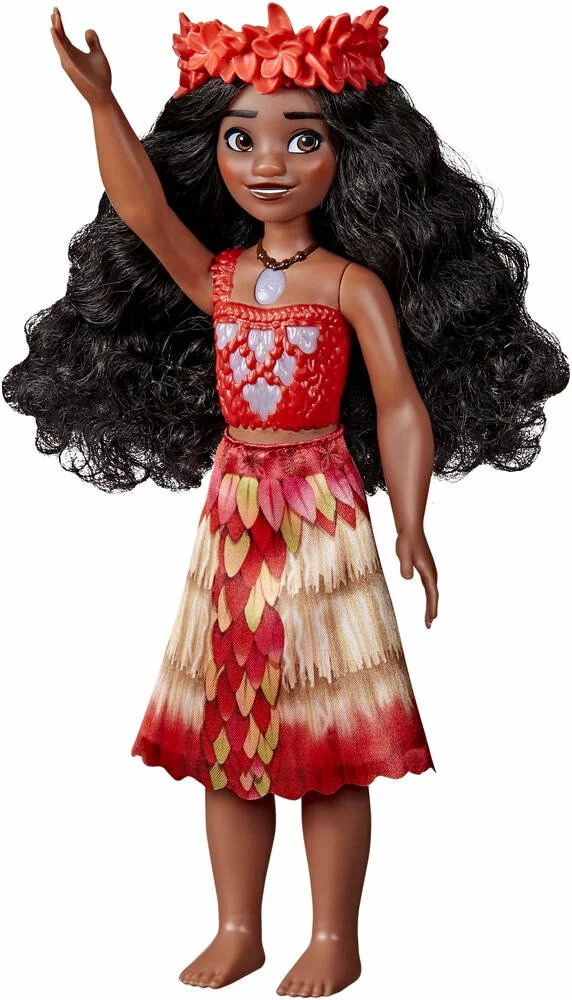 Poupée à l’effigie de Raiponce ou Vaiana. Lorsqu’on lève le bras de la poupée, elle chante pendant et son corset s’illumine.