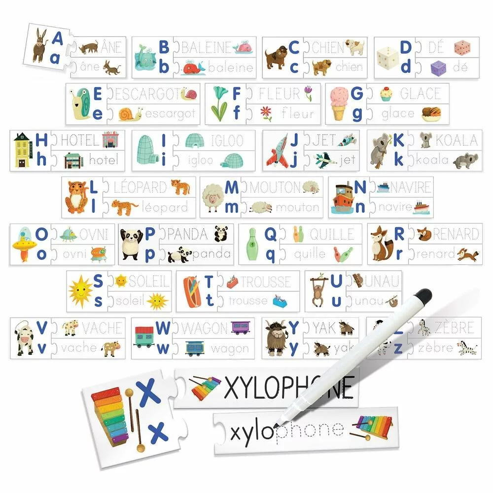 Apprends à lire et à écrire ! Associe les lettres et les images sur l’abécédaire ou entraîne-toi à écrire les mots en suivant les pointillés. 78 pièces et 1 feutre effaçable inclus. Ces puzzles sont conçus spécialement pour les enfants et à l’effigie de leurs personnages préférés. Ces images captivantes grâce à leurs couleurs lumineuses et brillantes permettent le développement du sens de l’observation chez l’enfant ainsi que ses compétences manuelles et logiques. La qualité des matériaux et l’utilisation d’une technique d’impression exclusive rendant ces images belles, vives et résistantes vous permettront de jouer encore et encore.