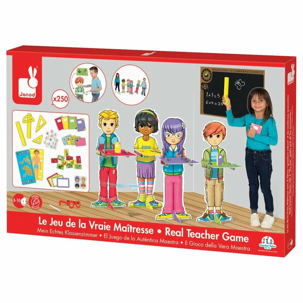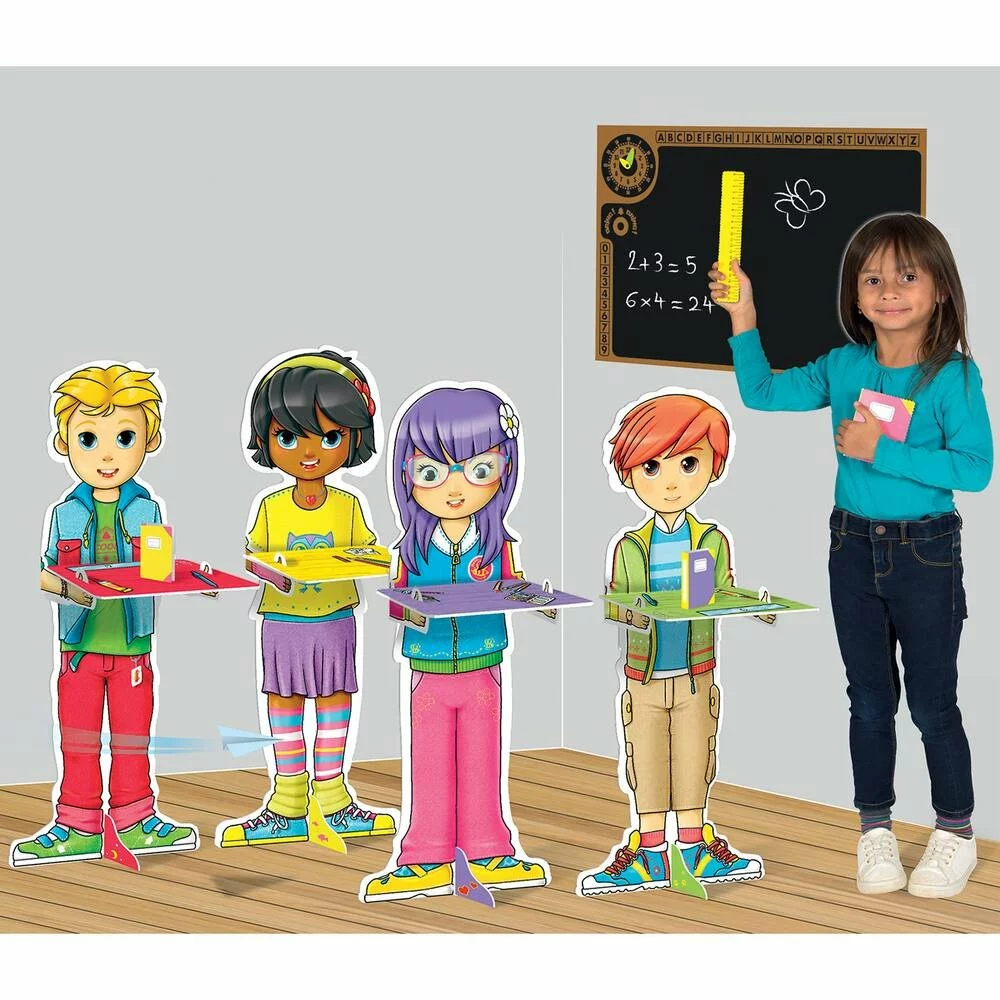 Livré 4 écoliers de 66 cm de haut et 250 accessoires pour devenir une véritable maîtresse d’école.