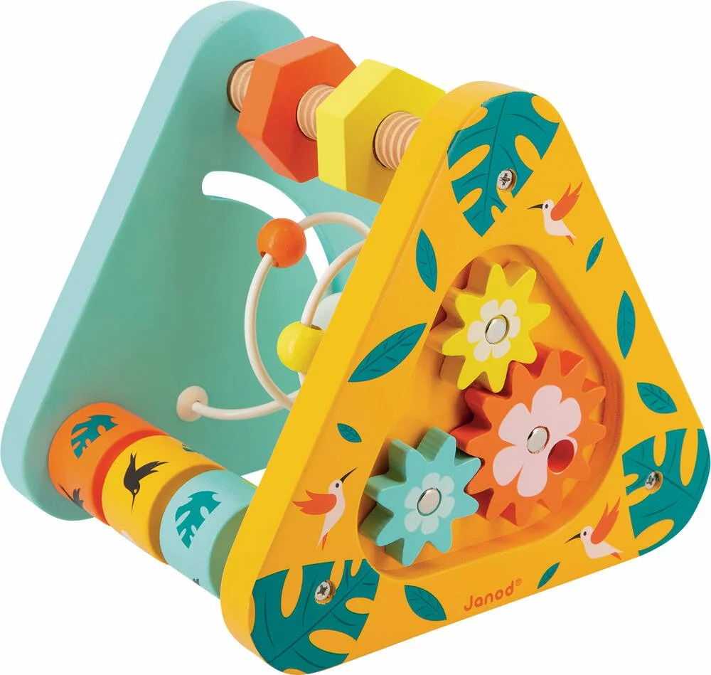 Ce triangle d’activitĂ©s aux couleurs multivitaminĂ©es vous fera voyager sous les tropiques ! Avec ses 7 activitĂ©s rĂ©parties sur ses 2 faces : labyrinthe, miroir, engrenages Ă tourner, Ă©crous Ă visser, boulier, bâton de pluie, cylindres Ă aligner, ce triangle accompagnera votre enfant dans ses premiers apprentissages. Ce triangle stimule l’ouĂŻe, la concentration et la motricitĂ© fine. Jouet en bois FSCTM et peinture Ă l’eau. Jouet d’Ă©veil pour les enfants Ă partir de 12 mois. Pour crĂ©er cette gamme nous avons pris la direction des tropiques Ă la recherche d’évasion, d’exotisme et de contraste. Pour illustrer au mieux cette nature sauvage, nous avons rĂ©uni des animaux joyeux aux couleurs vitaminĂ©es et des Ă©lĂ©ments vĂ©gĂ©taux aux teintes apaisantes.