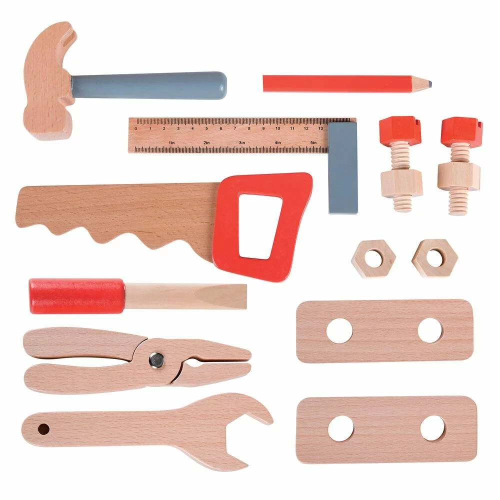 Ceinture incluant 16 pièces : 1 ceinture de bricolage en tissu ajustable en longueur, 1 marteau en bois, 1 clé, 1 tournevis, 1 règle, 1 scie, 1 pince, 2 boulons, 4 écrous, 1 crayon et 2 accessoires en bois. 16 pièces au total. Léger et facile à manipuler, ce jouet aide au développement de la motricité et de l’imaginaire.