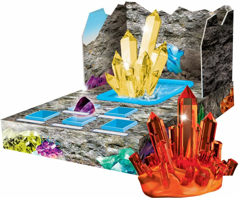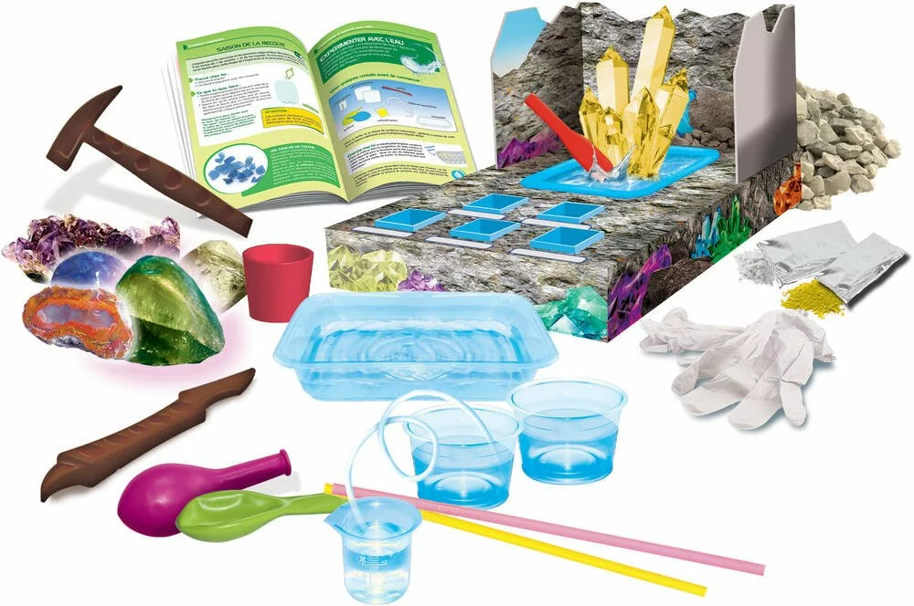 Un vrai kit pour découvrir les merveilles de la nature. Coffret de découverte et d’expériences sur les gemmes (ou pierres précieuses), les cristaux, l’eau et la glace. Expériences faciles et sans risque. Un livret illustré accompagne l’enfant pas à pas dans chacune des expériences. Gemmes : pour faire ses premiers pas dans le monde de la minéralogie. Creuse dans le bloc pour découvrir de vrais minéraux : quartz rose, aventurine, quartz et jaspe. Les cristaux : crée de magnifiques cristaux colorés. Expériences avec de l’eau et de la glace : des expériences faciles, sûres et amusantes pour découvrir l’incroyable comportement de l’eau et de la glace. De nombreux accessoires inclus : un bloc de plâtre à creuser, des fragments de minéraux, 1 marteau, 1 poinçon, 1 brosse, réactif et colorant (thiosulfate de sodium, colorant jaune), une structure » grotte » à assembler, des récipients pour les expériences, 1 spatule, des rochers, 1 verre coloré, 1 barquette, présentoirs de gemmes, gants de protection, 2 récipients transparents, un tube, un verre gradué, des ballons, des pailles et un manuel illustré.