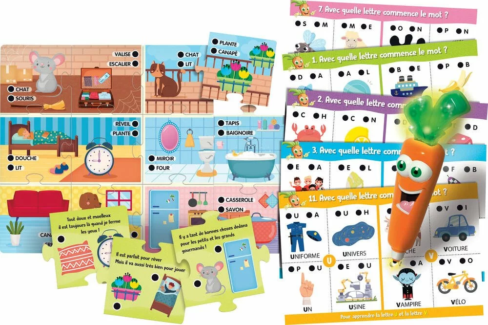 Apprends l’alphabet et les premiers mots grâce au stylo parlant, 8 fiches double face et 1 puzzle de 12 pièces. Effets sonores et lumineux.