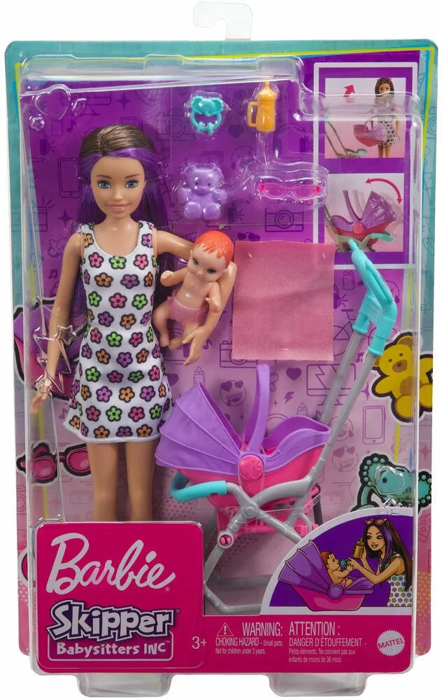 Le coffret inclut Skipper et un bébé, une poussette à rebonds et cinq accessoires sur le thème du maternage pour compléter le jeu avec les POUPEEs.