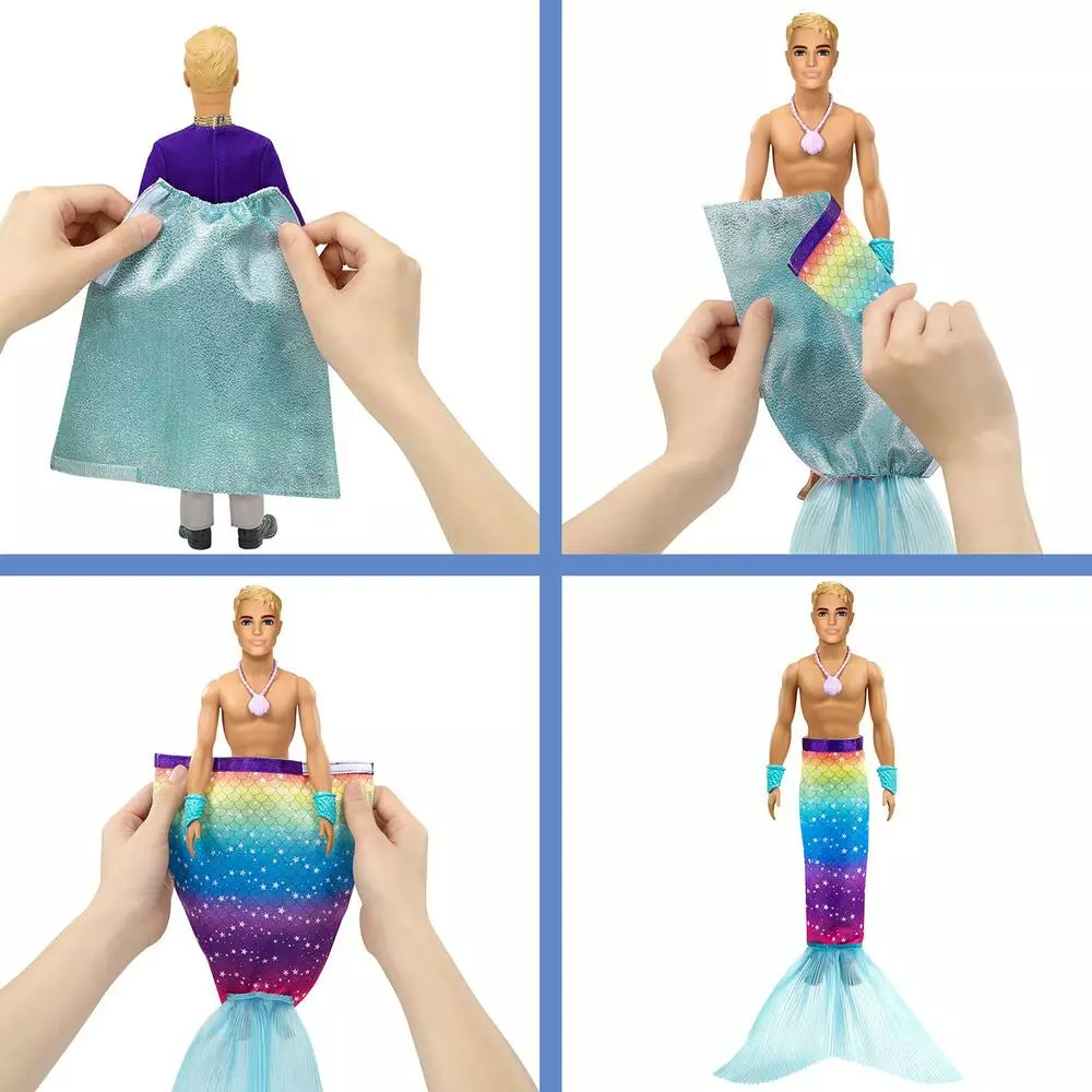 Avec sa cape royale qui se transforme en queue de sirène étincelante, ce Ken Dreamtopia peut devenir prince ou créature sous-marine magique en quelques secondes. Il suffit d’enlever son costume royal et sa cape et de la retourner, révélant ainsi une queue de triton arc-en-ciel à paillettes. Remettez-la ensuite sur la poupée pour un look totalement différent ! Fourni avec 1 couronne, 2 manchettes et 1 collier d’inspiration marine. (La poupée ne peut pas nager).