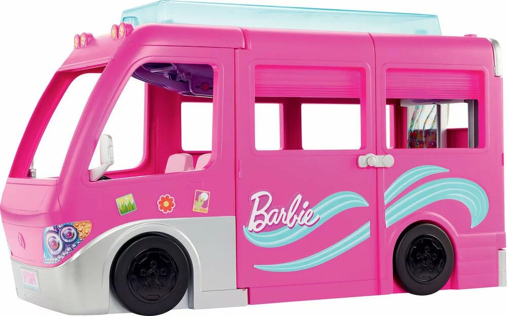 Prenez la route des histoires avec le Camping-Car Transformable de Barbie ! Comprenant sept zones de jeu, un toboggan et de nombreux accessoires pour stimuler l’imagination, le camping-car de Barbie inspirera d’innombrables aventures au grand air. Avec ses roues fonctionnelles et sa cabine deux places, les enfants peuvent charger le camping-car et prendre la route jusqu’à leur destination de rêve. Une fois sur place, ils peuvent ouvrir le camping-car pour profiter d’une cuisine, d’un coin repas, d’un espace de couchage, d’une salle d’eau, d’une piscine, d’un toboggan et d’un coin télé. Barbie et ses amis vont adorer monter à l’échelle et descendre le toboggan jusque dans la piscine ! Personnalisez le véhicule de la poupée Barbie grâce à la feuille d’autocollants pour pare-chocs sur le thème du camping et explorez des possibilités de jeu infinies avec plus de 60 éléments de jeu inclus, dont 2 chiots ! Envie de changer de cadre ? Rangez tout à l’intérieur du camping-car, fermez-le et reprenez la route. Les enfants de 3 ans et plus vont adorer sillonner les routes de leur imaginaire à bord du Camping-Car Transformable de Barbie, car avec Barbie, ils peuvent être tout ce qu’ils veulent ! Poupées non incluses. Les couleurs et les décorations peuvent varier.