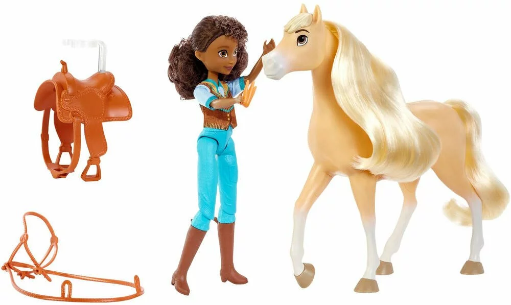 Recréez les histoires d’amitié, de courage et d’aventure de la franchise Spirit des studios DreamWorks avec la poupée Apo (environ 18 cm) et sa jument adorée Chica Linda (environ 20 cm) ! Apo porte un jean en plastique moulé et un joli haut en tissu. Dotée de 7 points d’articulation, elle peut prendre une multitude de poses. Chica Linda peut bouger la tête pour reproduire son air espiègle et d’autres attitudes, et possède une crinière toute douce. Également inclus dans le coffret : une selle, des rênes, une brosse et un ensemble de carottes. Le système de fixation maintient Apo en selle lorsqu’elle monte à cheval. Les couleurs et les décorations peuvent varier.