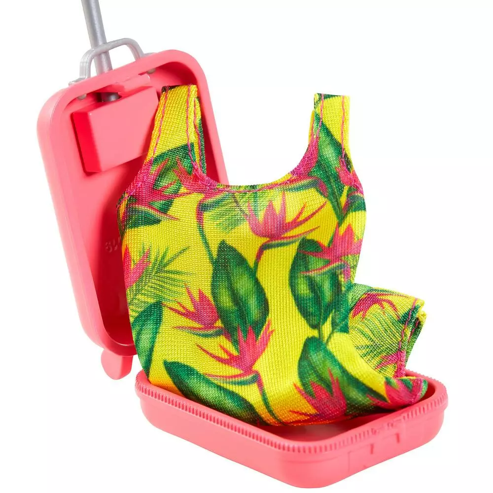 La poupée voyage avec 3 accessoires (une valise à roulettes, un maillot de bain, un accessoire de voyage) et un petit chien.