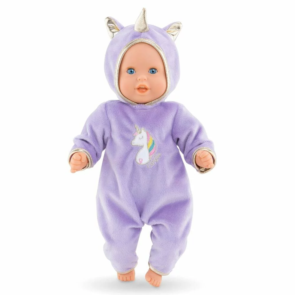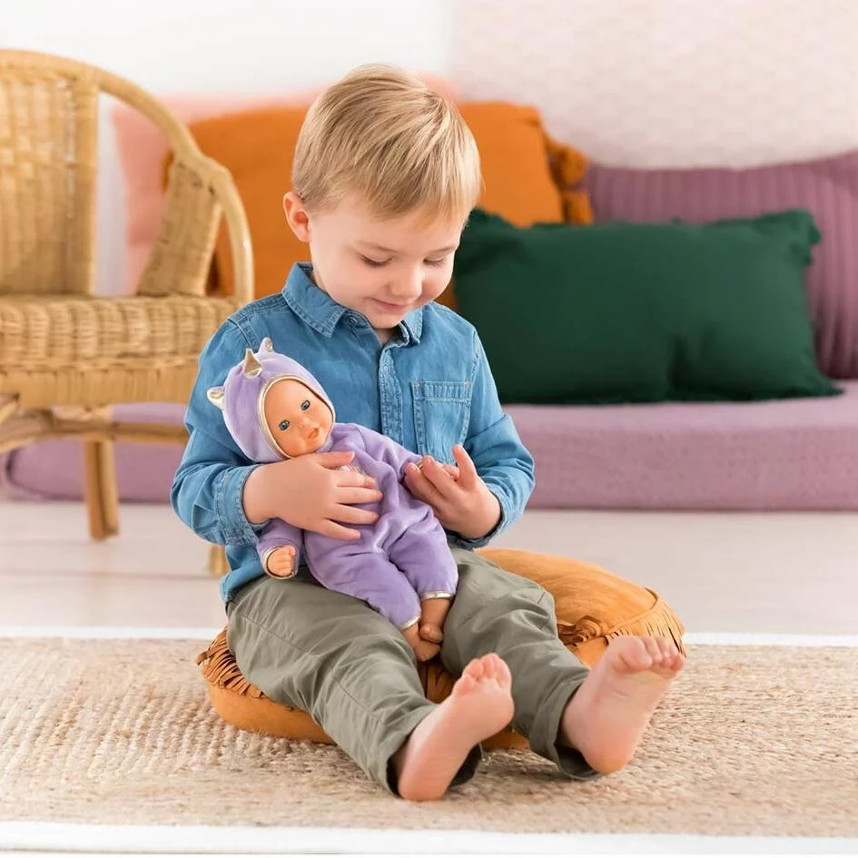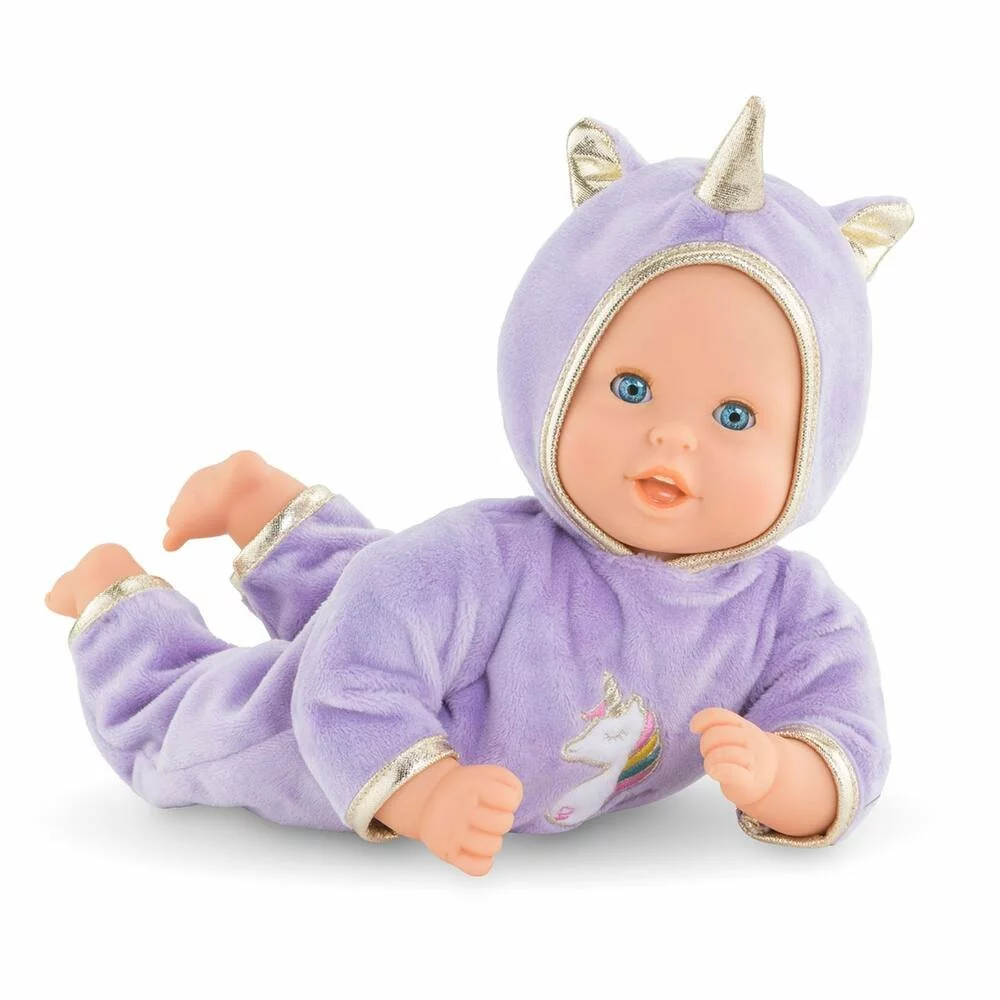BĂ©bĂ© Calin Licorne est un petit poupon de 30cm; la taille parfaitement adaptĂ©e aux petits bras et mains de l’enfant pour le manipuler. Son corps souple lui permet de prendre les mĂŞmes positions qu’un vrai bĂ©bĂ©. Son visage; ses bras et ses jambes; Ă la dĂ©licate senteur de vanille; sont en vinyle doux au toucher. Avec ses yeux dormeurs; il fait dodo quand on le couche sur le dos. Il est habillĂ© d’un pyjama Ă capuche avec une broderie « Licorne ». La capuche est munie d’une corne dorĂ©e et de deux petites oreilles.