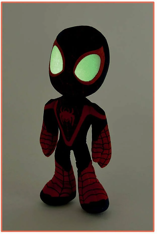 Marvel : Spidey and his Amazing Friends. Peluche phosphorescente de 25 cm. 3 modèles assortis : Spidey, Miles Morales ou Ghost Spider. Fonctionne sans pile : se charge à la lumière. 100% polyester. Lavage en surface.