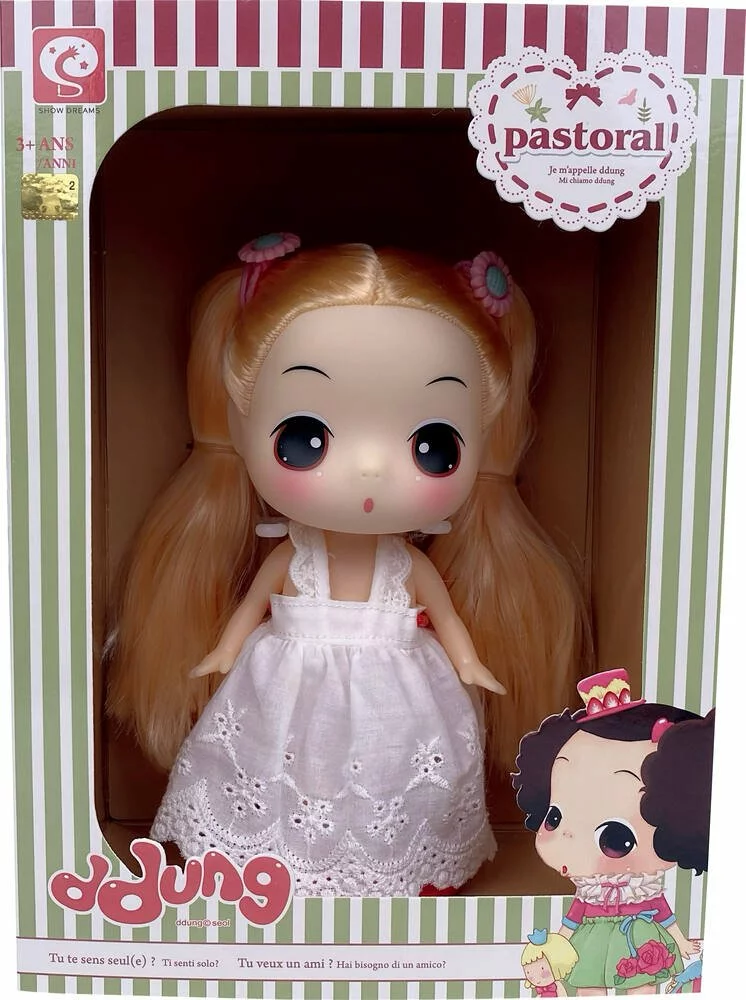 Poupée articulée de 18 cm, en vinyle. Elle porte une robe blanche champêtre, des élastiques dans les cheveux, une culotte et des chaussures. Les vêtements sont amovibles. Un portant de présentation inclus permet de faire tenir la poupée debout. dimensions 18.5 x 9.5 x 25 cm. Licence : Ddung.