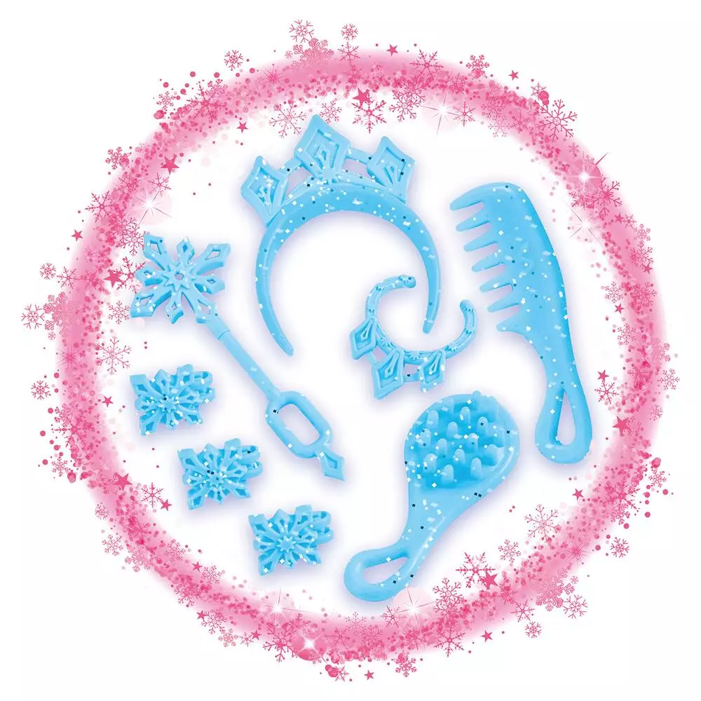 Mini poupée mannequin Evi 12 cm. Evi porte une robe de princesse, de très longs cheveux, une couronne pailletée et un collier. Un peigne, une brosse, des barrettes et un bâton de cérémonie sont inclus.
