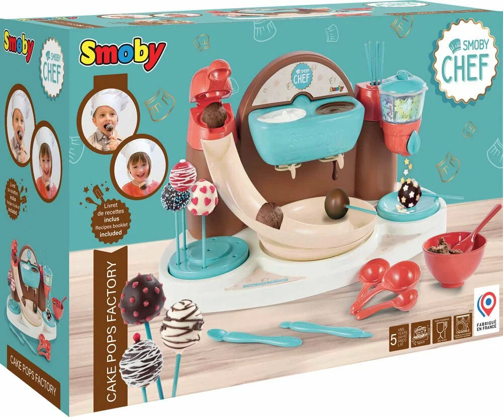 Playset complet pour réaliser des cake pops en s’amusant, avec des actions de cuisine drôles : les cake pops sautent sur la rampe et débaroulent ! Nombreux accessoires inclus : 10 pics à cake pop, 1 distributeur de décorations sucrées, 20 rubans, 20 sachets, 2 outils de customisation, 1 bol, 3 cuillères mesureuses, 1 grosse cuillère, et 1 livre de recettes. Il suffit de réaliser la pâte à cake pops, de former les boules, et de les faire glisser sur la rampe. Il ne reste plus qu’à les napper du chocolat préalablement fondu au bain marie, et de les décorer avec le distributeur de décorations sucrées.