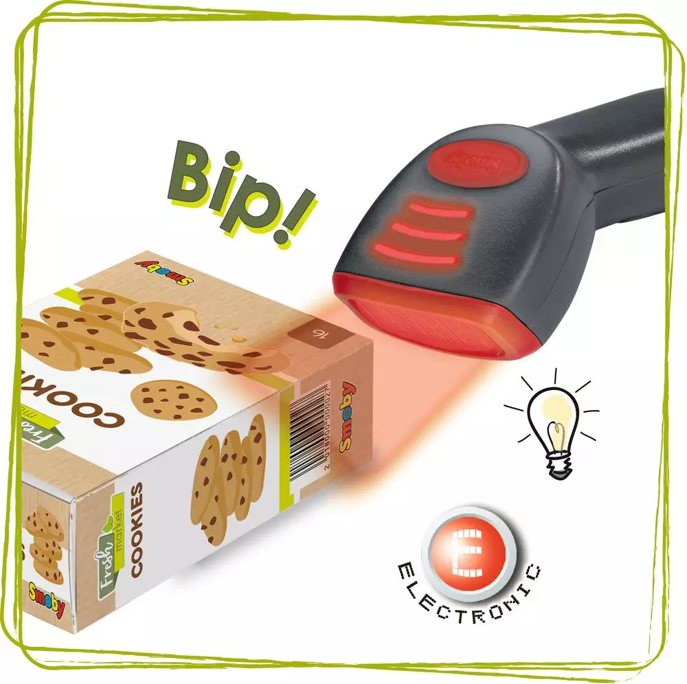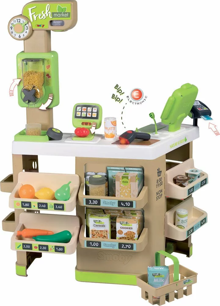 Dirige ton propre magasin Bio, avec plusieurs espaces de jeu, horloge et panneau d’enseigne réglables. 1 distributeur de nourriture en vrac, 1 balance, 1 micro et 1 lecteur de carte bancaire. 1 panier et 43 accessoires inclus. Effets sonores et lumineux.