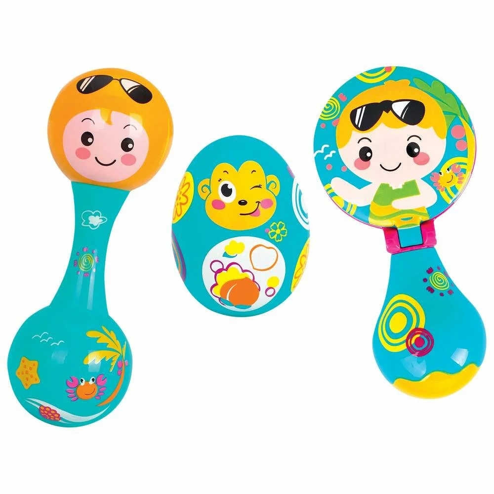 Set de 3 hochets colorĂ©s et ludiques. Avec 1 maraca double, 1 Ĺ“uf musical et 1 castagnette. Pour les musiciens en herbe. Apprendre Ă travers le jeu stimule l’intĂ©rĂŞt de votre enfant pour la musique. Ce jeu dĂ©veloppe les capacitĂ©s d’Ă©coute et la crĂ©ativitĂ© musicale. AmĂ©liore la concentration et la coordination. Matière : ABS. Dimensions de la maraca double : 5 x 5 x 15 cm, de l’oeuf : 4 x 4 x 8 cm, de la castagnette : 5 x 5 x 14 cm.