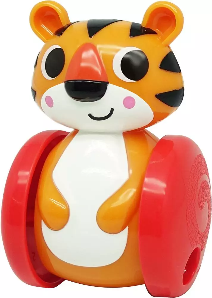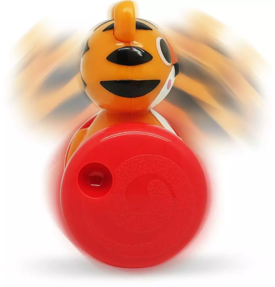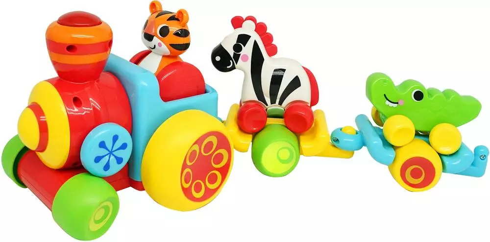 Train safari avec effets sonores et lumineux. Appuie sur la cheminée de la locomotive pour entendre de la musique et voir des lumières clignotantes. Train composé d’une locomotive et de deux wagons : locomotive avec un tigre basculant, un wagon avec un zèbre et l’autre avec un crocodile. Permet à l’enfant de découvrir différents mouvements.
