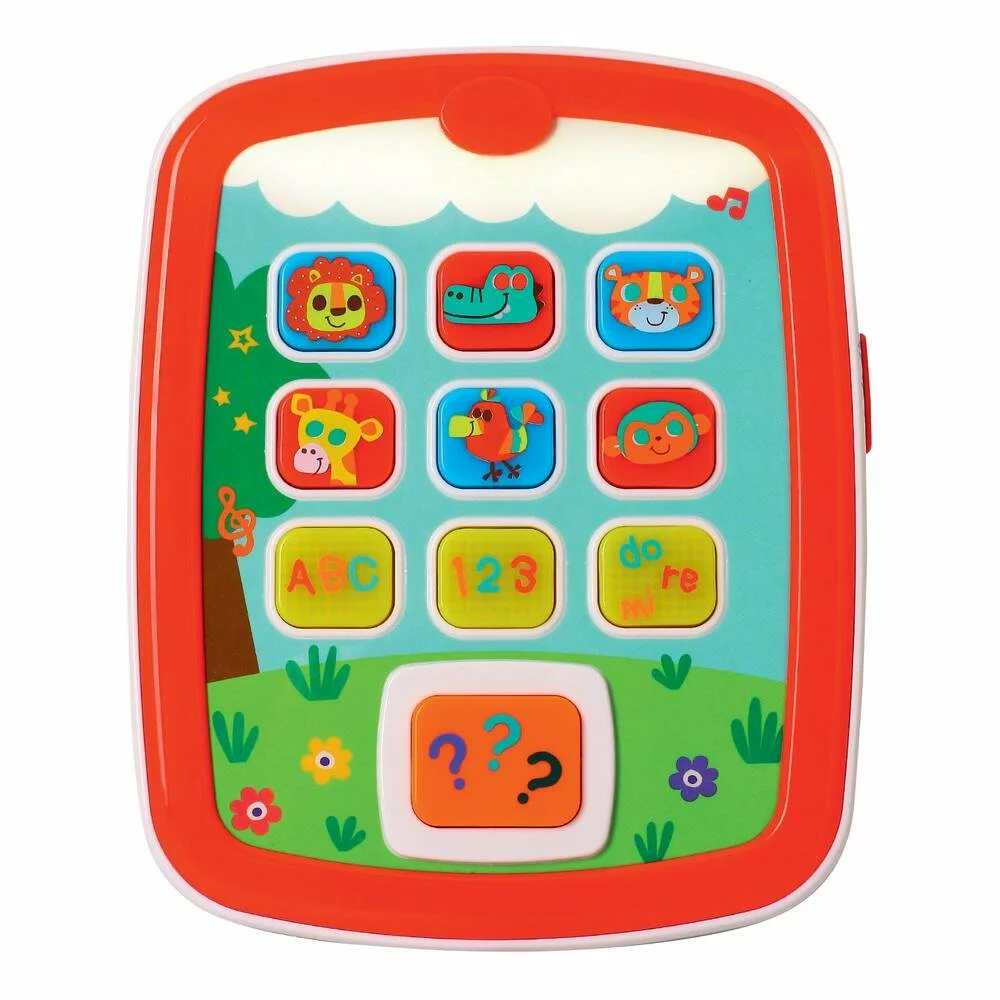 Tablette avec effets sonores et lumineux. Pour découvrir et apprendre les lettres, les chiffres et les animaux. Amusant. Facile à manipuler. Ce jouet comporte des effets sonores et des lumières clignotantes pour stimuler la curiosité, les sens de votre bébé et pour développer ses habiletés cognitives. Touche des lettres : appuie sur une touche pour entendre la lettre correspondante accompagnée d’une lumière clignotante ; cela encourage votre bébé à répéter les lettres et à apprendre l’alphabet. Touche des chiffres. Boutons des animaux : appuie sur le bouton d’un animal pour activer des sons d’animaux, de la musique et des effets sonores. Touches Do, Ré, Mi : appuie sur une touche pour jouer la note correspondante avec un accompagnement musical. Avec arrêt automatique et réglage du volume sonore. En plastique.