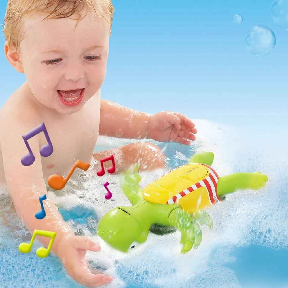 Et si nous chantions en jouant dans le bain ? Voici une tortue pas comme les autres ! Son truc ? Chanter pendant qu’elle nage ! Cette tortue chante, nage sur le ventre et sur le dos ! Tournez le remontoir sur sa carapace et elle nagera joyeusement sur le ventre en battant des pattes. Appuyiez sur sa tête pour entendre le « Danube Bleu ». Chanter c’est son dada, elle le fait même la tête sous l’eau en produisant des Glou-Glou rigolos !