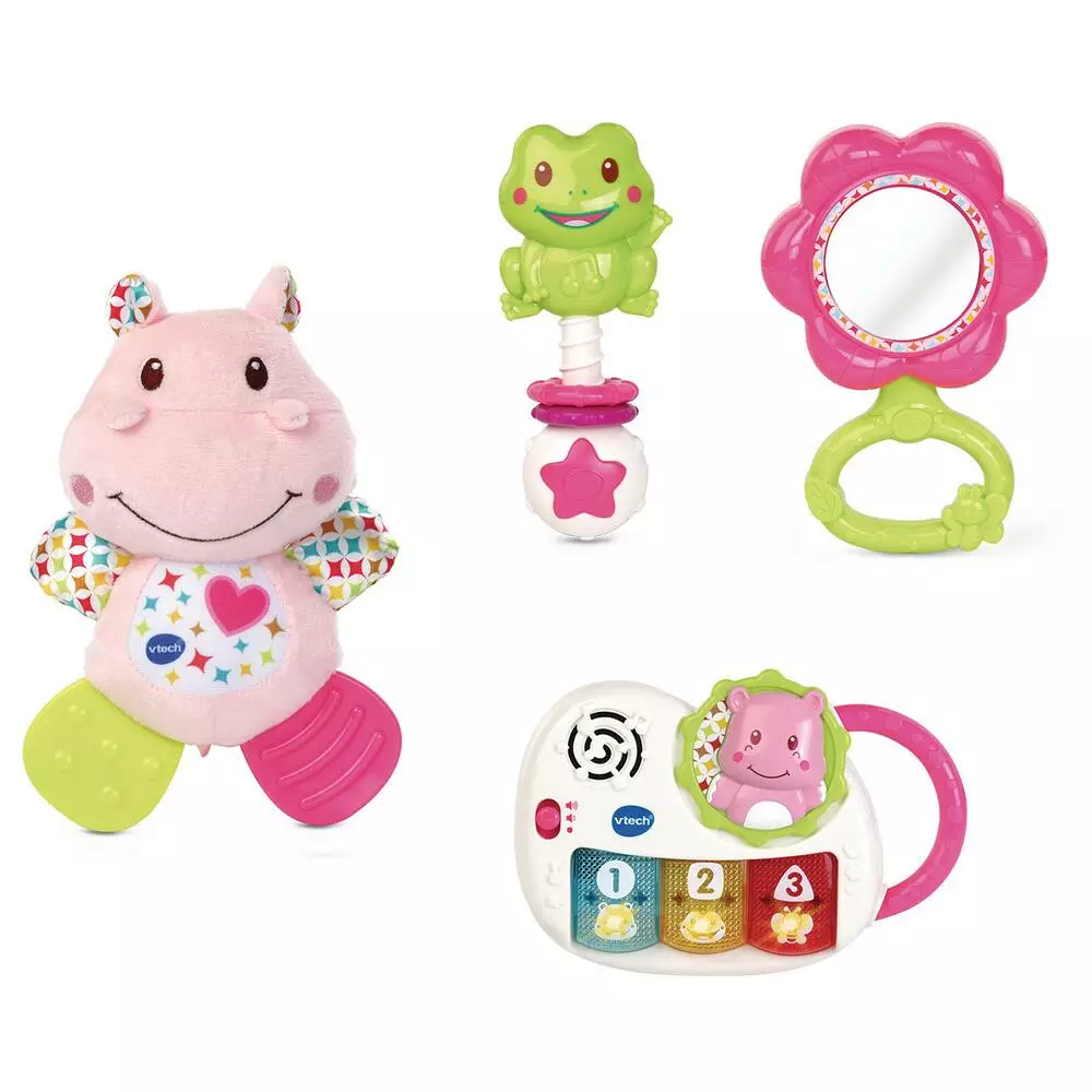 Un coffret complet pour éveiller Bébé : un hippo en peluche tout doux avec différentes textures et des pattes en plastique souple pour apaiser les poussées dentaires de bébé ; un piano avec sons et lumières pour stimuler la motricité et l’ouïe de bébé tout en douceur ; un miroir en forme de fleur pour encourager la découverte de soi ; un hochet grenouille qui développe le toucher et stimule la motricité. Plus de 45 chansons, mélodies, sons et phrases.