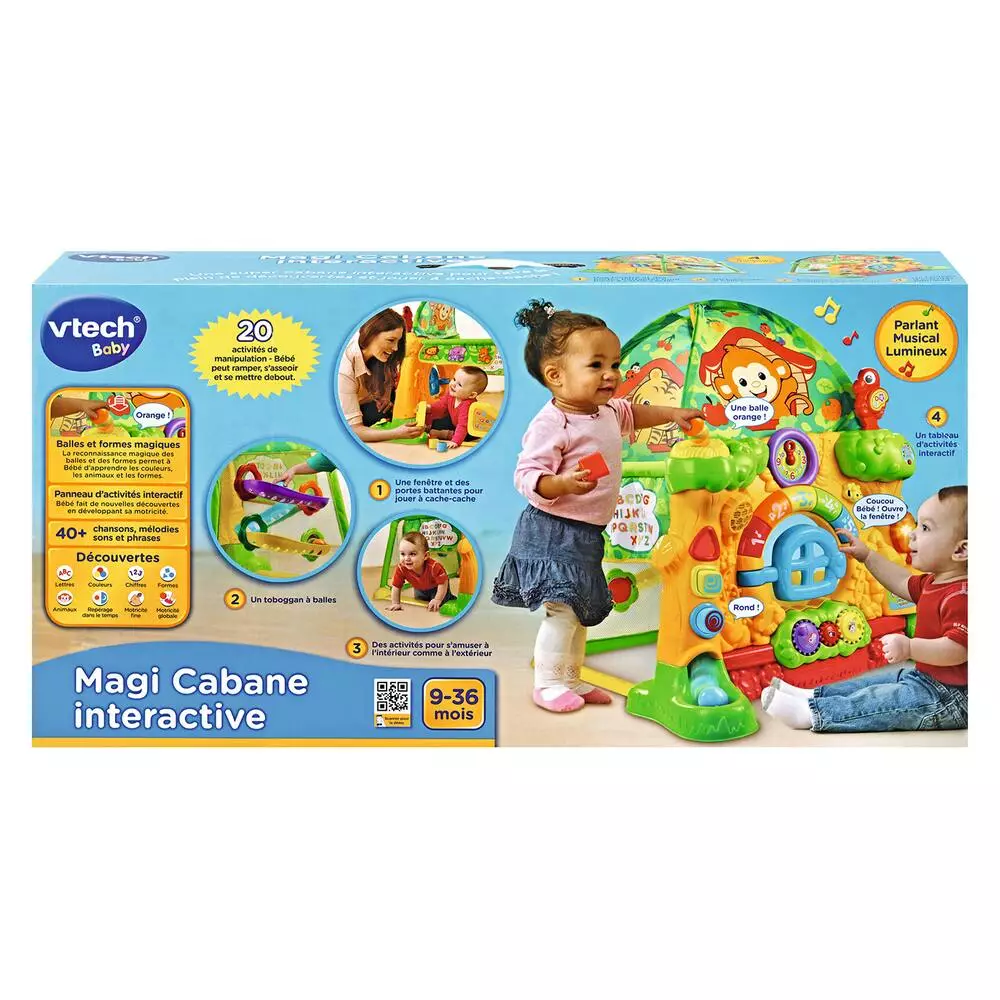 Une super cabane interactive parlante, musicale et lumineuse pour faire plein de dĂ©couvertes et jouer Ă cache-cache. BĂ©bĂ© peut jouer Ă l’intĂ©rieur et Ă l’extĂ©rieur de la cabane grâce aux 4 panneaux d’activitĂ©s. Il apprend les couleurs, les formes, les animaux, les moments de la journĂ©e, l’alphabet et les chiffres. 20 activitĂ©s de manipulation : bĂ©bĂ© peut ramper, s’asseoir et se mettre debout. 1 fenĂŞtre et 1 porte battante pour jouer Ă cache-cache. 1 toboggan Ă balles. 1 tableau d’activitĂ©s interactif avec : 1 piano pour dĂ©couvrir la musique, 1 trieur de forme, des balles colorĂ©es et 1 horloge pour apprendre les chiffres et les moments de la journĂ©e. Des engrenages, 1 panneau abĂ©cĂ©daire et plus de 40 mĂ©lodies, chansons, effets sonores et phrases. RĂ©glage du volume sonore. ArrĂŞt automatique.
