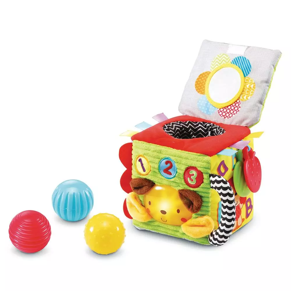 Cube interactif éveil sensoriel. De 3 à 24 mois. Bébé développe son sens du toucher en jouant avec les 6 faces du cube. 3 boutons pour découvrir les couleurs, les formes, les chiffres et bien plus encore. Le visage de l’ours s’illumine au rythme des mélodies. Différentes textures et des éléments à manipuler pour développer la motricité fine de Bébé. Trois balles de jeu aux différentes matières incluses. Plus de 50 chansons, mélodies, sons et phrases. Arrêt automatique.