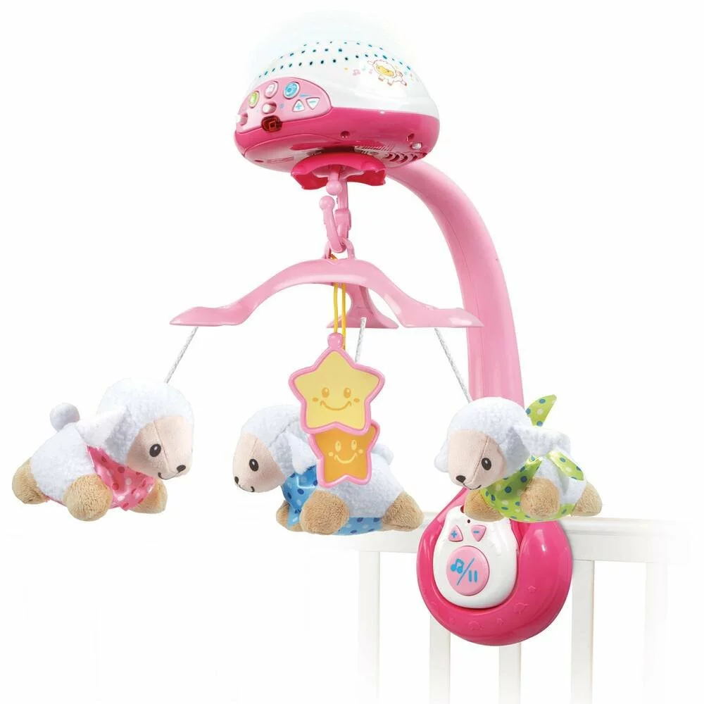 Un mobile 3 en 1 avec télécommande et projecteur détachable : mobile, projection lumineuse étoilée avec variation de couleurs et veilleuse : projection avec variation de couleurs (rouge, verte ou bleue). Le mobile tourne doucement en musique et les 3 petits moutons colorés en tissu rassurent Bébé. Grâce au capteur sonore intégré, les mélodies se déclenchent automatiquement aux pleurs de Bébé pour l’aider à se rendormir. Il est possible de désactiver cette fonction. La télécommande fournie permet de contrôler le mobile à distance (marche/arrêt et réglage du volume sonore). Pratique, elle peut se ranger dans le corps du mobile. Le globe lumineux est détachable et s’utilise comme projecteur ou simple veilleuse lorsque Bébé grandit. 40 mélodies, 7 sons apaisants (sons de la nature et bruits blancs) ainsi que 4 chansons apaisent Bébé. Avec minuterie pour écouter 5, 15 ou 30 minutes de musique en continu. S’attache facilement à tous les types de lits munis de barreaux. Réglage du volume sonore. Attention afin d’éviter tout risque de blessure à un enchevêtrement, ôter le jouet dès que l’enfant tente de se mettre à quatre pattes ou de ramper.