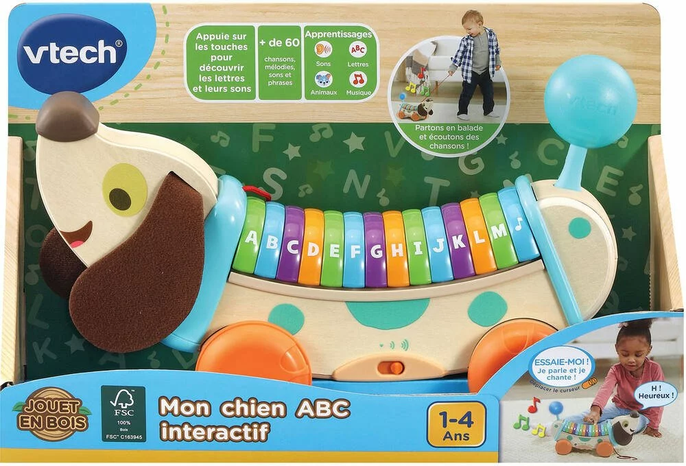 Un chien au look vintage pour découvrir l’alphabet ! • Un chien-piano en bois FSC à faire rouler , au look vintage, qui accompagnera l’enfant dans son apprentissage de l’alphabet et l’aidera à développer sa motricité globale. • Grâce à 28 boutons lettres et découvertes, l’enfant découvrira les lettres, leurs sons ainsi que les mots associés et des anecdotes sur le petit chien. • Le bouton note de musique active 3 chansons différentes. En appuyant sur le bouton chien, l’enfant pourra écouter des petites phrases rigolotes. • Pour encourager l’enfant à avancer, un détecteur de mouvements déclenche des phrases et des chansons dès que l’enfant fait rouler le chien. • Ses oreilles en feutrine sont douces à caresser , sa queue est lumineuse . • Arrêt automatique et réglage du volume sonore