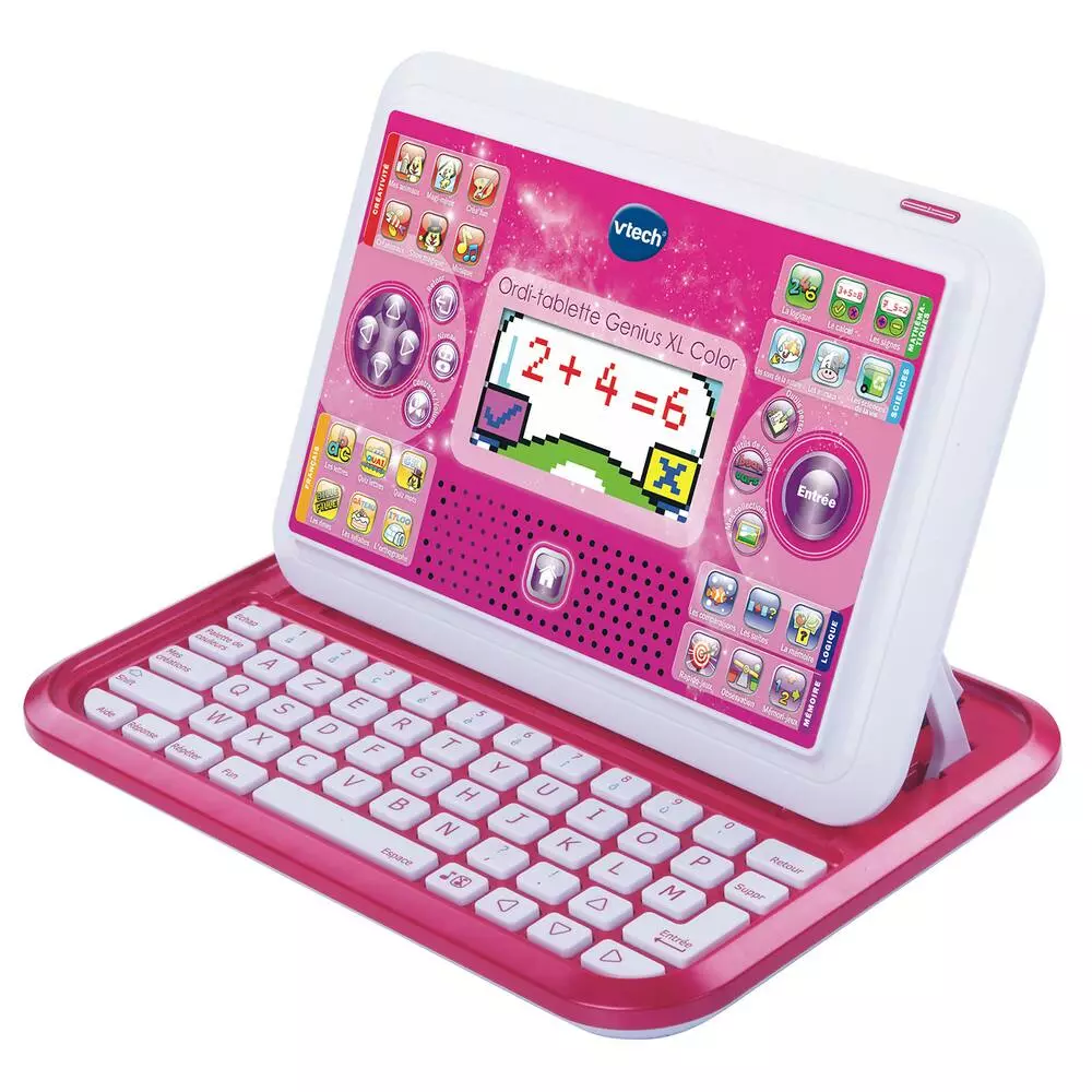 2 en 1 : une tablette éducative avec écran couleur qui se transforme en ordinateur portable ! Un format original : se transforme de tablette en ordinateur d’un glissement de doigts ! 80 activités sont réparties en 27 catégories pour découvrir le dessin, les lettres, le son des lettres, l’orthographe, le vocabulaire, les chiffres, le calcul, la musique, les sciences, la logique et bien plus encore ! Possibilité d’enregistrer jusqu’à 350 créations artistiques : coloriage d’images, choix de décors, de personnages (dinosaures, créatures marines) et de couleurs pour créer ses propres images. Ecran couleur et clavier AZERTY. Il convient aux enfants de 5 à 8 ans.