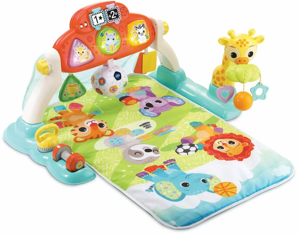 Un tapis 4 en 1 sur le thème du sport qui évolue avec bébé et stimule tous ses sens : Sur le dos : Bébé s’amuse à taper dans le ballon de foot et joue avec les hochets suspendus à la girafe. Sur le ventre : Il joue avec les hochets poids et haltère pour déclencher des sons mécaniques amusants. Assis : Le tableau d’éveil interactif pivote à 45° pour lui permettre de faire le plein de découvertes. Il appuie sur les trois boutons lumineux pour déclencher des interactions. Tableau d’éveil détachable : Quand Bébé sait marcher, le tableau interactif se détache pour être transporté partout. Effets sonores et lumineux, nombreuses textures et matières à manipuler pour développer tous les sens de Bébé. 2 modes de jeu : Musique et découvertes 7 chansons et 15 mélodies. Réglage du volume sonore et arrêt automatique.