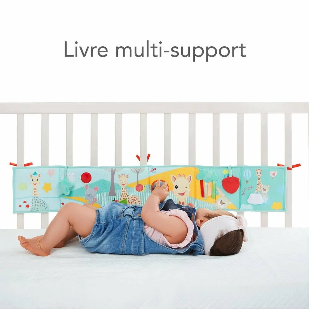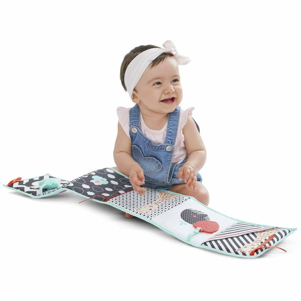 Un livre à déplier qui éveille les sens de bébé ! Il se compose de 12 pages dotées de nombreuses activités : des couleurs vives et contrastées, des rubans et des matières variées (papier froissé, feutrine, velour…), un pouet, un miroir, un anneau de dentition